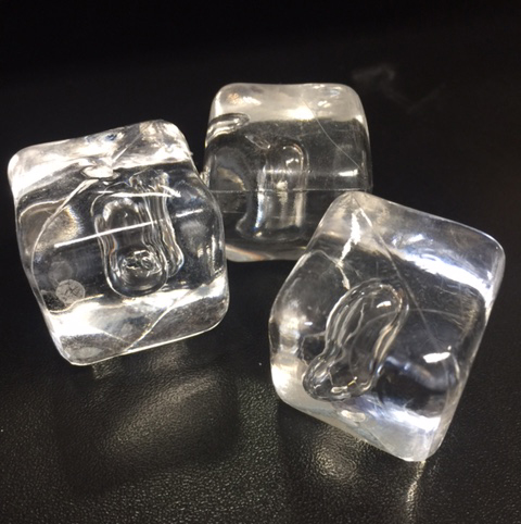 1″ acrylic ice cubes with bubbles. Bubbles vary in size and number with visible mold marks. In one dozen sets.