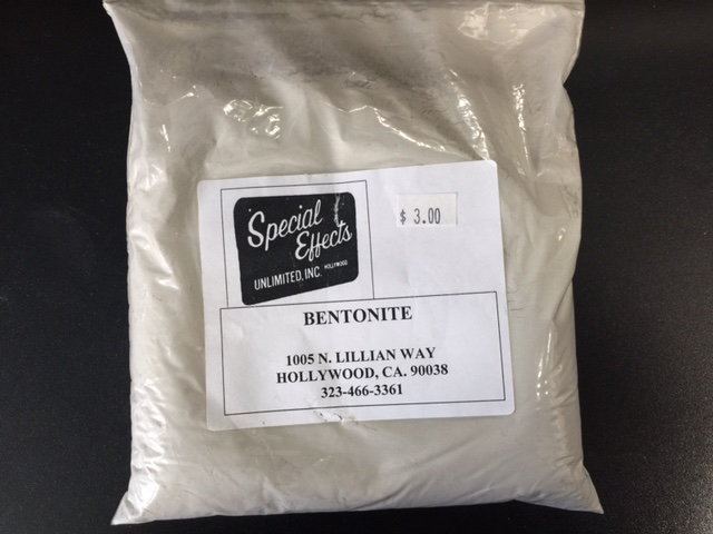 Bentonite is a clay material that is light grey in color.  When mixed with water it becomes very slippery and is good for mud wrestling, mud baths, simulating wet concrete etc.    When used dry,
