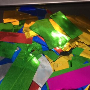 Gold Mylar Confetti.  3/4″ x 2″ rectangles in 1 lb. bags